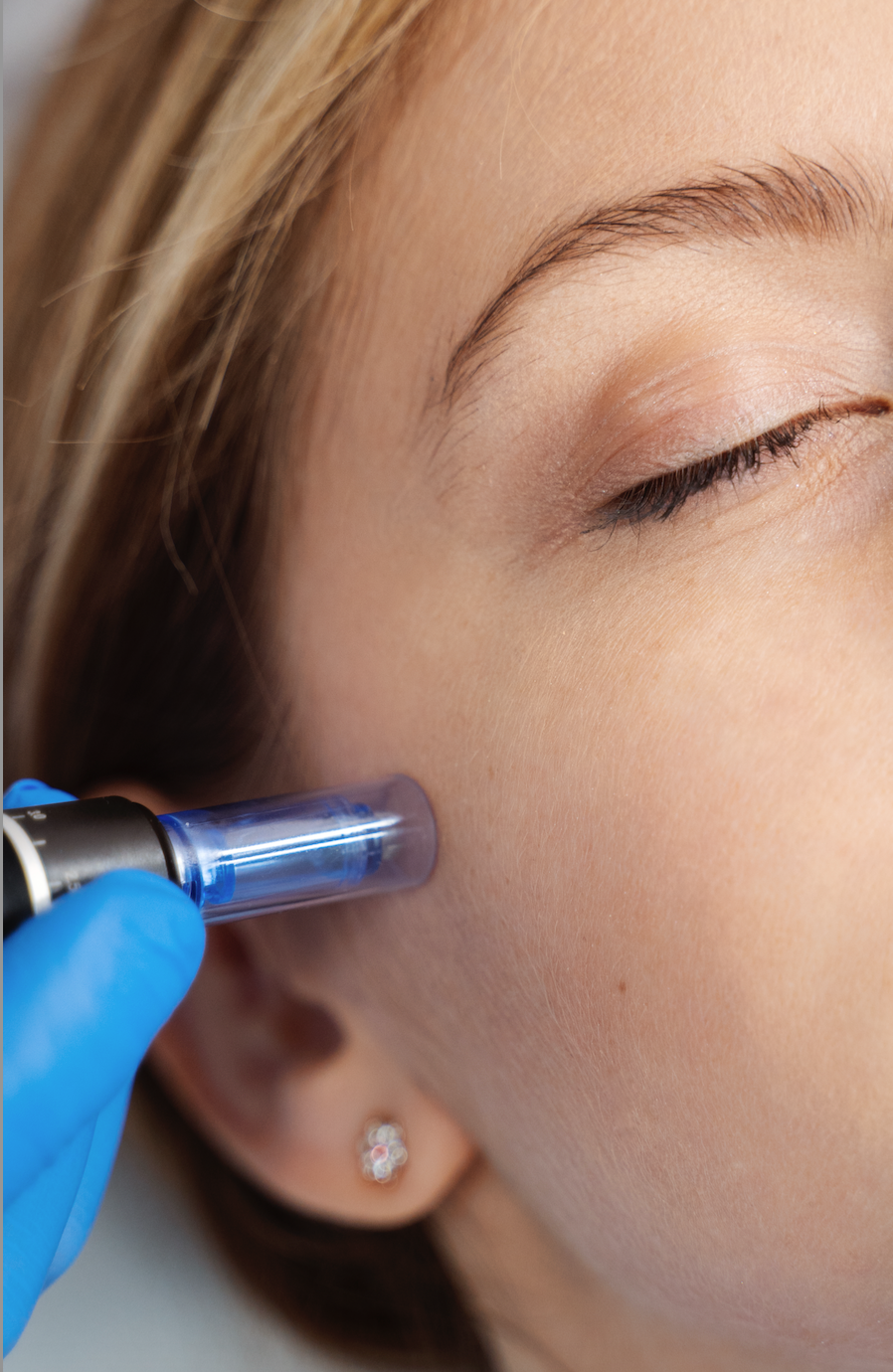 Behandling med en microneedling pen som med små nåler skaper mikroskopiske kanaler i huden. Dette stimulerer hudens helbredelsesprosess og øker produksjonen av kollagen og elastin, og kan forbedre hudens struktur og utseende.